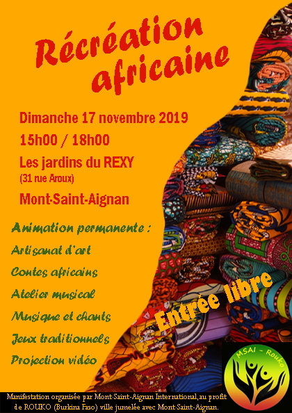À 18h, réception afin d’officialiser la poursuite du jumelage entre Mont-Saint-Aignan et Rouko en présence des deux Maires. Un pot clôturera cette journée où nous vous attendons nombreuses et nombreux !