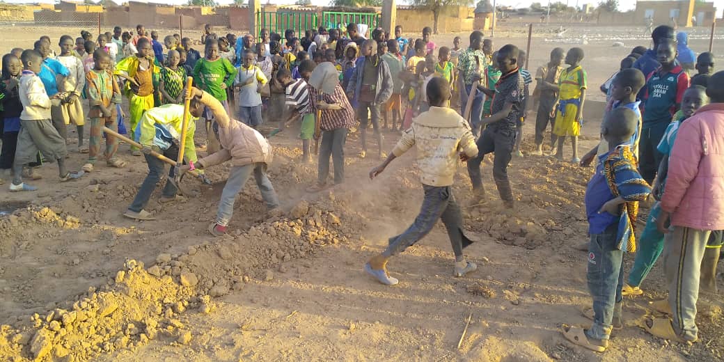 La terre est dure, mais les hommes y ont mis toute leur énergie et l’apport en terre en provenance des bas-fonds contribuera à amender le sol et d’obtenir des récoltes abondantes. Le puit, relié à un forage, permettra aux élèves d’arroser les cultures. Bientôt, ce sera le repiquage !